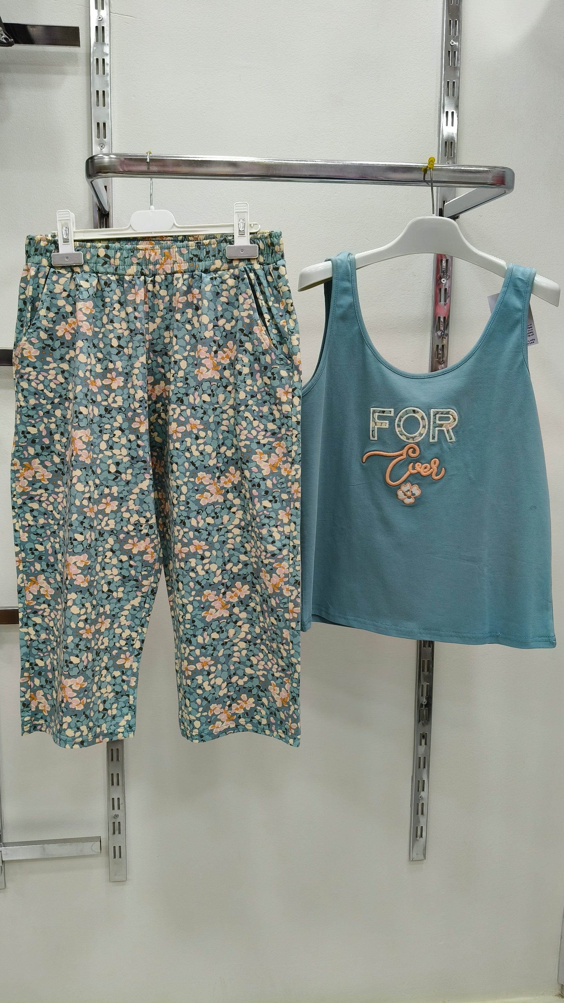 استمتعي بإطلالة منعشة ومريحة مع هذا الطقم الصيفي المميز. الطقم مصنوع من القطن الناعم لتمنحك شعورًا بالانتعاش والراحة. يتميز بتصميم عصري يجمع بين قطعة علوية بـ حمالات وتطريز أنيق على الصدر وبرمودا بنقوش زهرية جذابة، مما يجعله خيارًا مثاليًا لقضاء أوقات ممتعة في المنزل.