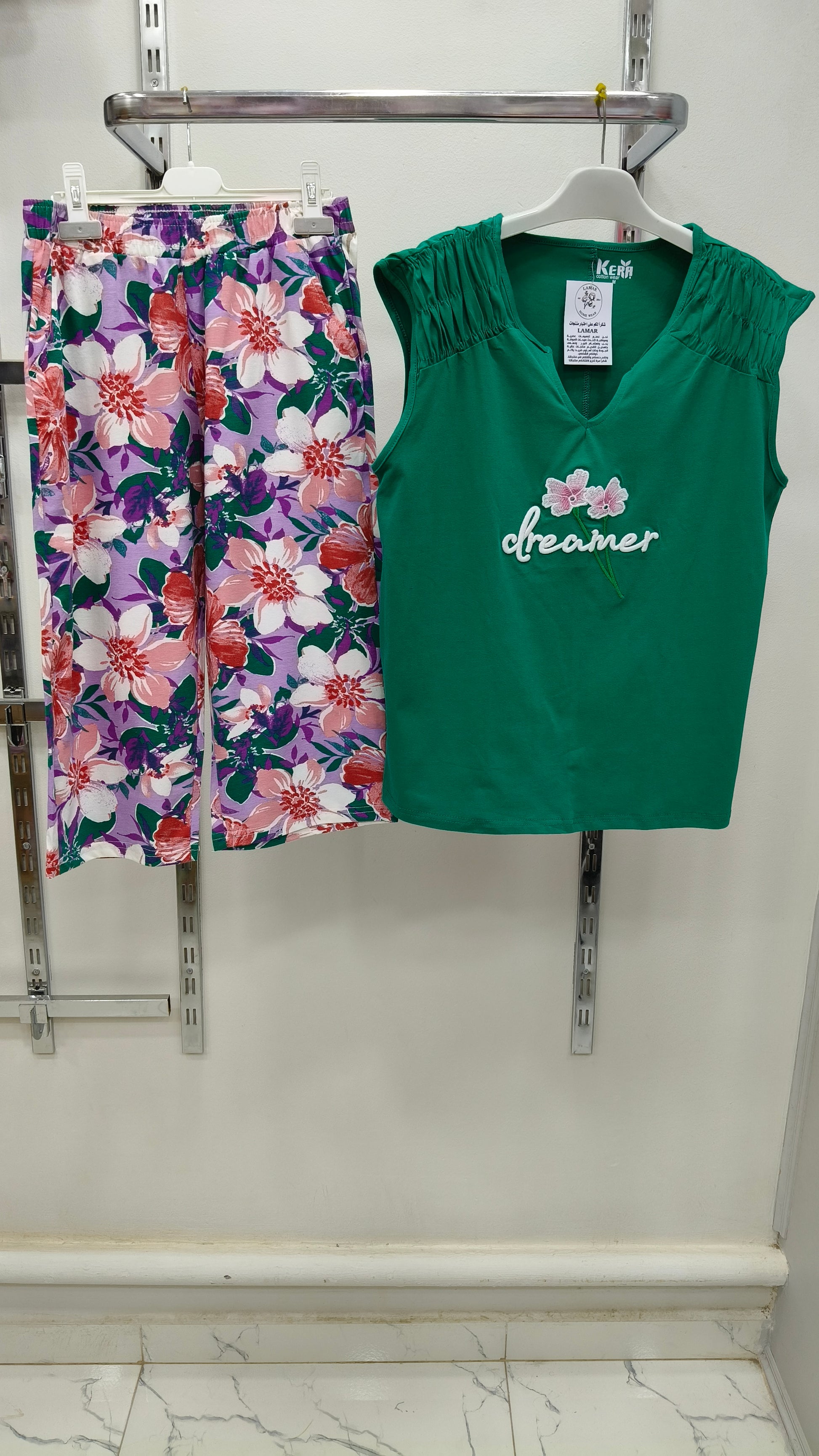 استمتعي بإطلالة صيفية منعشة ومريحة مع هذا الطقم المميز. الطقم مصنوع من القطن الناعم لتمنحك شعورًا بالانتعاش والراحة. يتميز بتصميم عصري يجمع بين التي شيرت الكت السادة مع تطريز أنيق على الصدر والبرمودا بنقوش زهرية عصرية، مما يجعله مثاليًا للاسترخاء في المنزل.