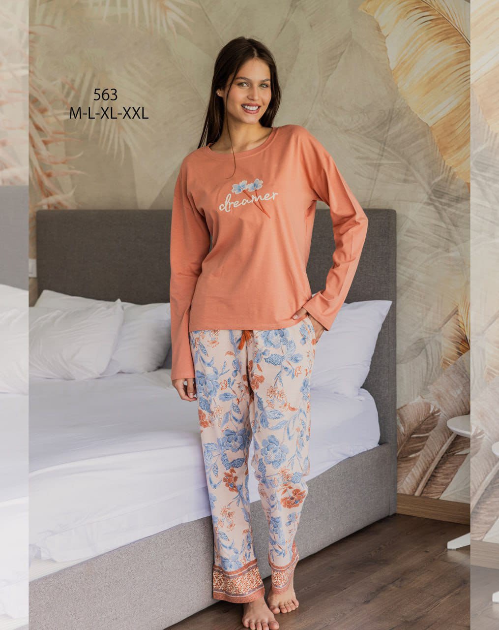 القميص العلوي بأكمام طويلة ومزين بعبارة "dreamer" باللون الأبيض بطريقة راقية، مع زخرفة زهرية صغيرة تضيف لمسة شخصية وحيوية على البدلة.
