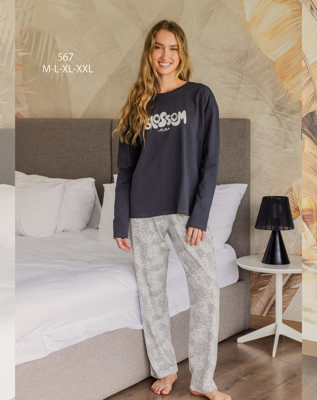 الفستان العلوي: طويل الأكمام مع تصميم كلاسيكي يحتوي على رسالة "BLOSSOM" باللون الأبيض، مما يضفي لمسة إيجابية ومبهجة.